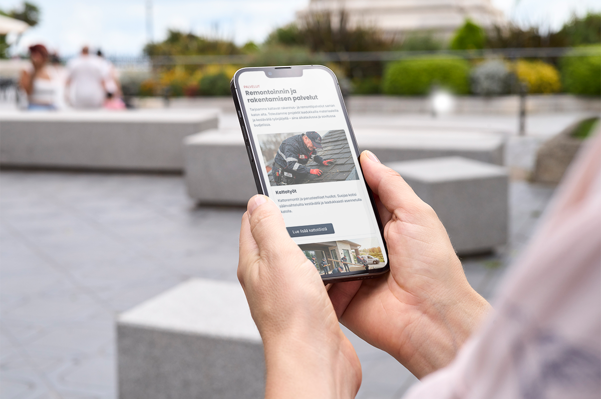 Sivusto on rakennettu erityisesti luottamuksen herättämiseen ja liidien keräämiseen. Se tuo työnäytteesi upeasti esiin dynaamisissa gallerioissa, viestii asiantuntijuuttasi ja tekee tarjouspyynnön jättämisestä asiakkaalle naurettavan helppoa, katsoipa hän sivuja sitten isolta ruudulta tai puhelimesta. Me hoidamme tekniikan, jotta sinä voit keskittyä tekemään sitä, missä olet parhaimmillasi.